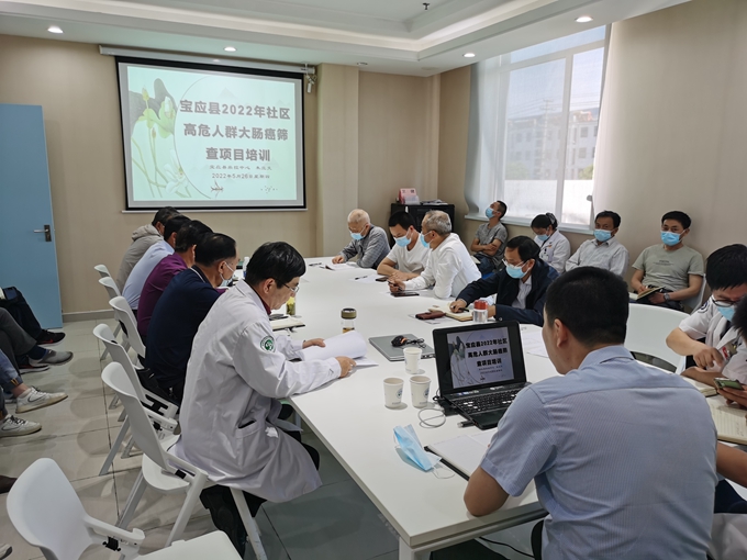 2022年5月26日下午,在宝应县射阳湖镇中心卫生院召开宝应县社区高危人群大肠癌筛查工作启动培训会议,县疾控中心、射阳湖镇卫生院、社区医务工作人员30余人参加会议。县疾控中心慢病科负责人解读《宝应县2022年社区居民大肠癌高危人群筛查项目实施方案(试行)》、讲解评估调查问卷、随访信息收集等,射阳湖镇卫生院分管负责人强调大肠癌筛查工作的意义、工作安排、人员分工及筛查工作要求。
