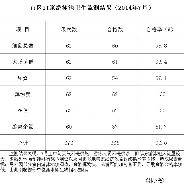 市区11家游泳池卫生监测结果(2014年7月)