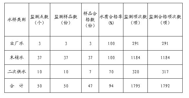 备注:按照2016年江苏省生活饮用水水质监测工作方案,对扬州市第一、四、五3个市政水厂的出厂水、37个管网末梢点及10家二次供水单位的水质进行第三季度采样监测。其中:对3份出厂水进行全分析监测一次,监测项目为97项;对37份末梢水、10份二次供水进行常规监测一次,监测项目为32项。监测结果表明:二次供水水质不合格指标为游离性余氯。