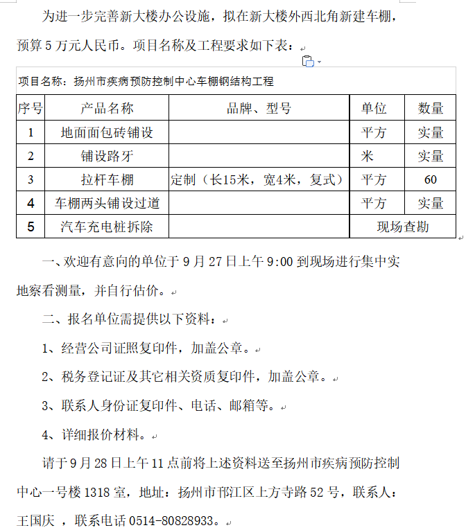 扬州市疾病预防控制中心车棚钢结构工程询价采购公告