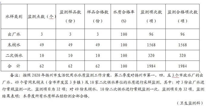 2020年第二季度扬州主城区城市生活饮用水及市开发区3乡镇农村生活饮用水质卫生监测情况