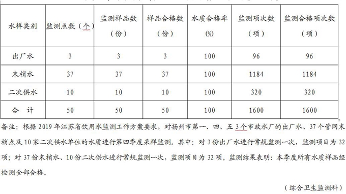 2019年第四季度扬州市城市生活饮用水水质卫生监测情况统计表